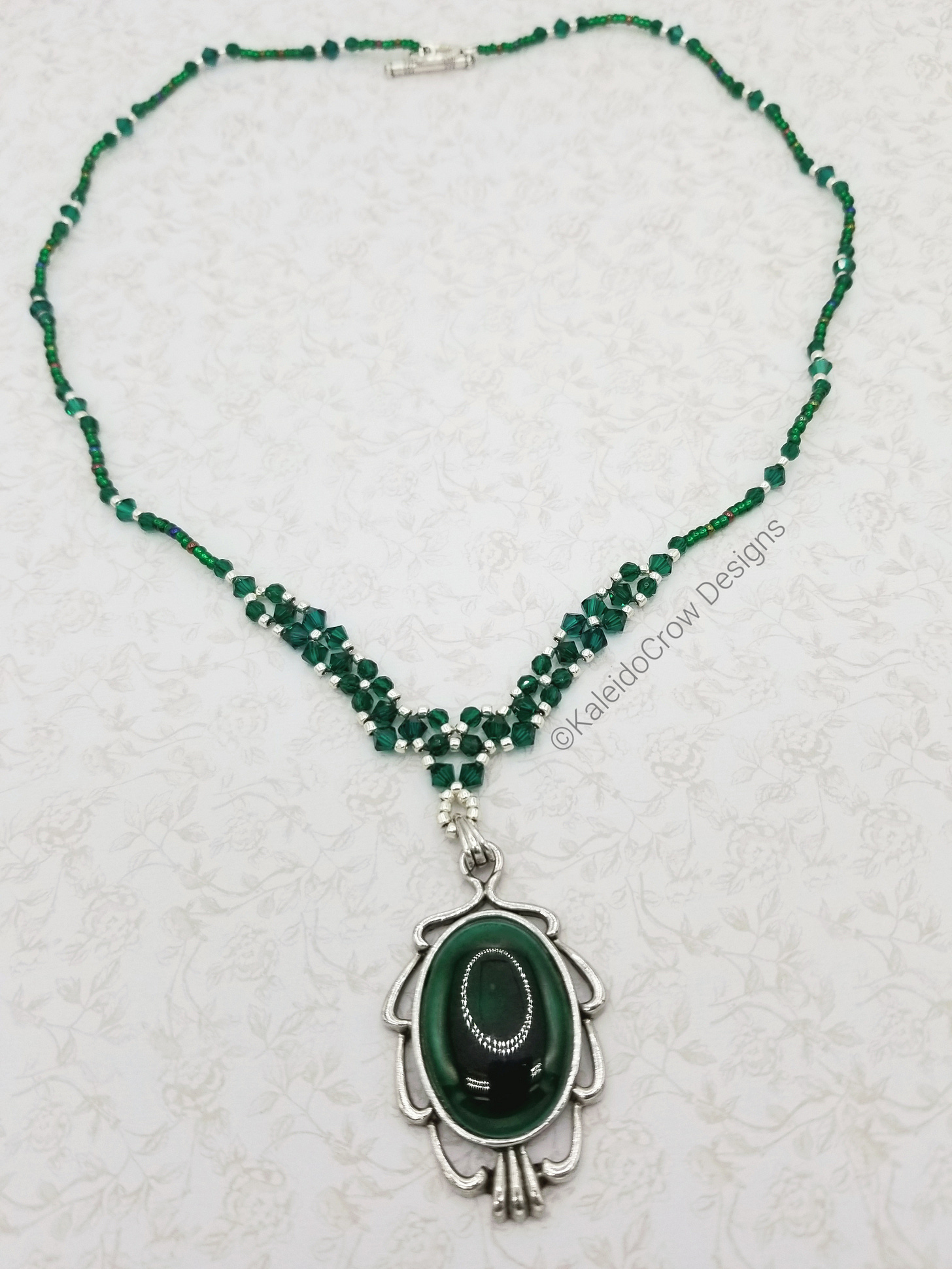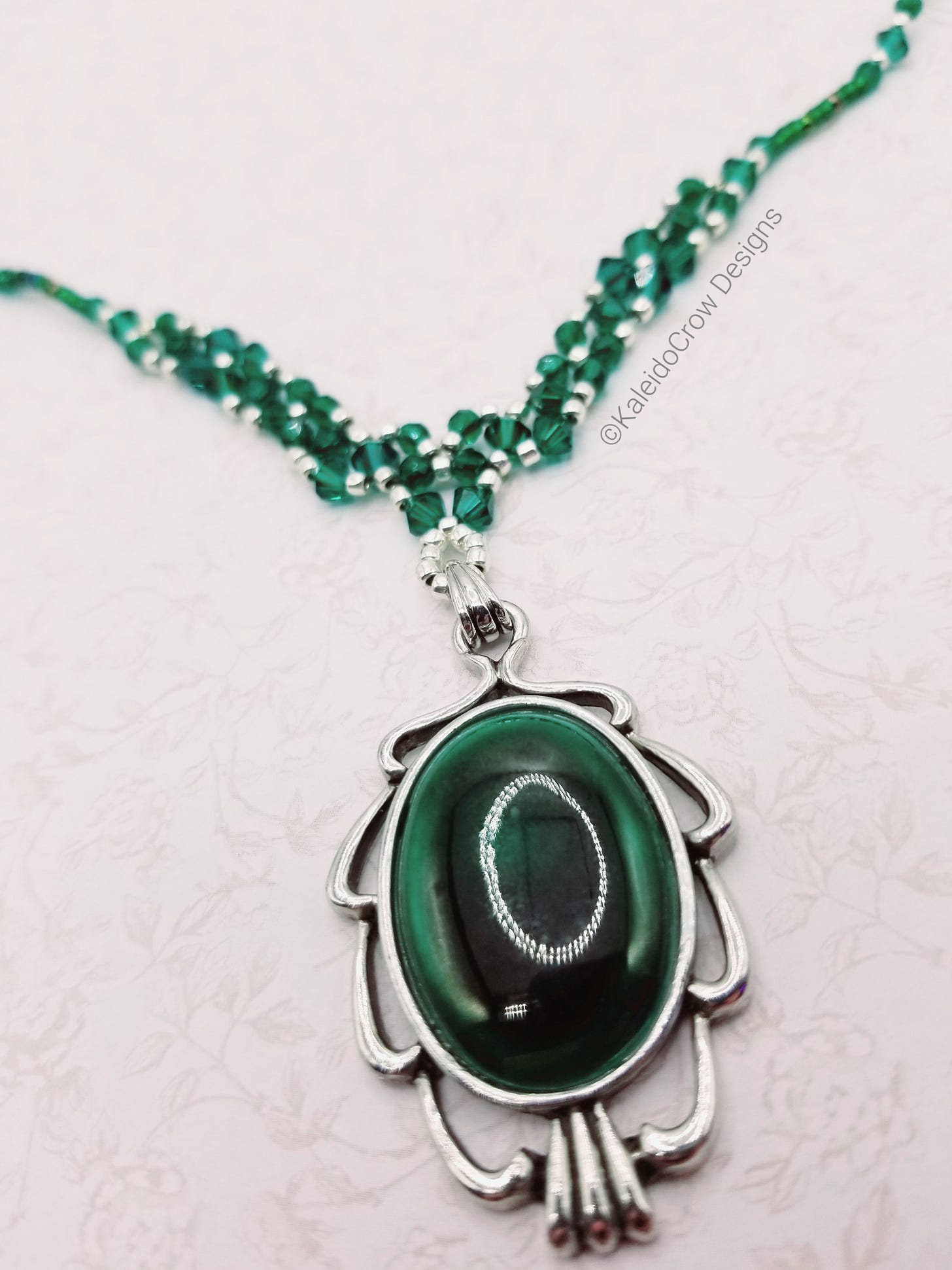 Sadly, this piece was stolen while I had it on display at a local art show in April 2025. I have enough beads to remake it, but I don’t have any more of those cabochons or bezels.