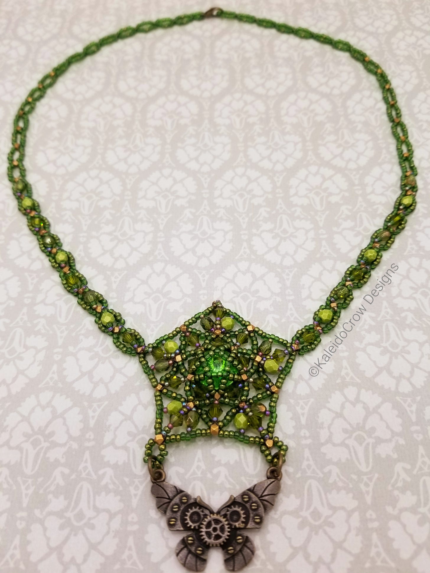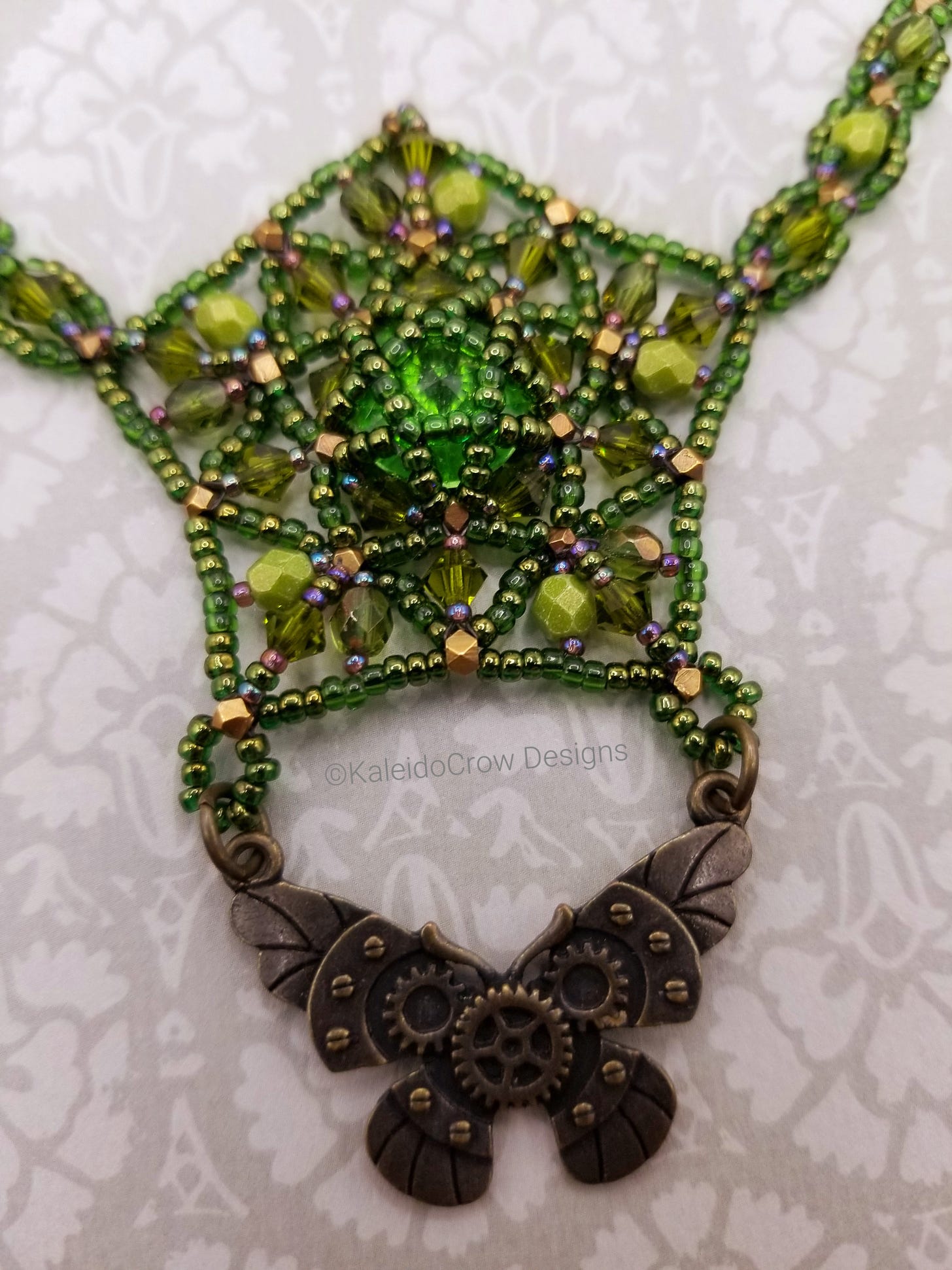After I made the earrings, I found this bronze steampunk butterfly in my supplies. Mom wasn’t terribly into Steampunk (I was kind of into it during its heyday in the late ‘00s and early ‘10s) but she always called it “Steamrock” which I thought was adorable. This butterfly was the perfect color for this set! This was actually my introduction to beading around rivolis as well, as you can see in the center of the star.