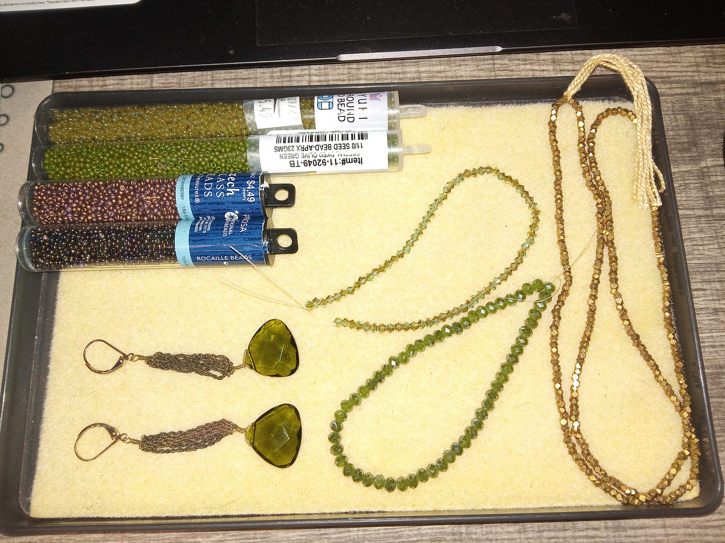 My mother passed away in March of 2023. She loved butterflies and earth toned colors. When I was able to go through her jewelry, I found these earrings with these great olive green teardrop beads but I hated the chains they were on, and the ear hooks. I decided to make some earrings to revive them and although these aren’t colors I usually wear, I have a skirt that goes great with that green.