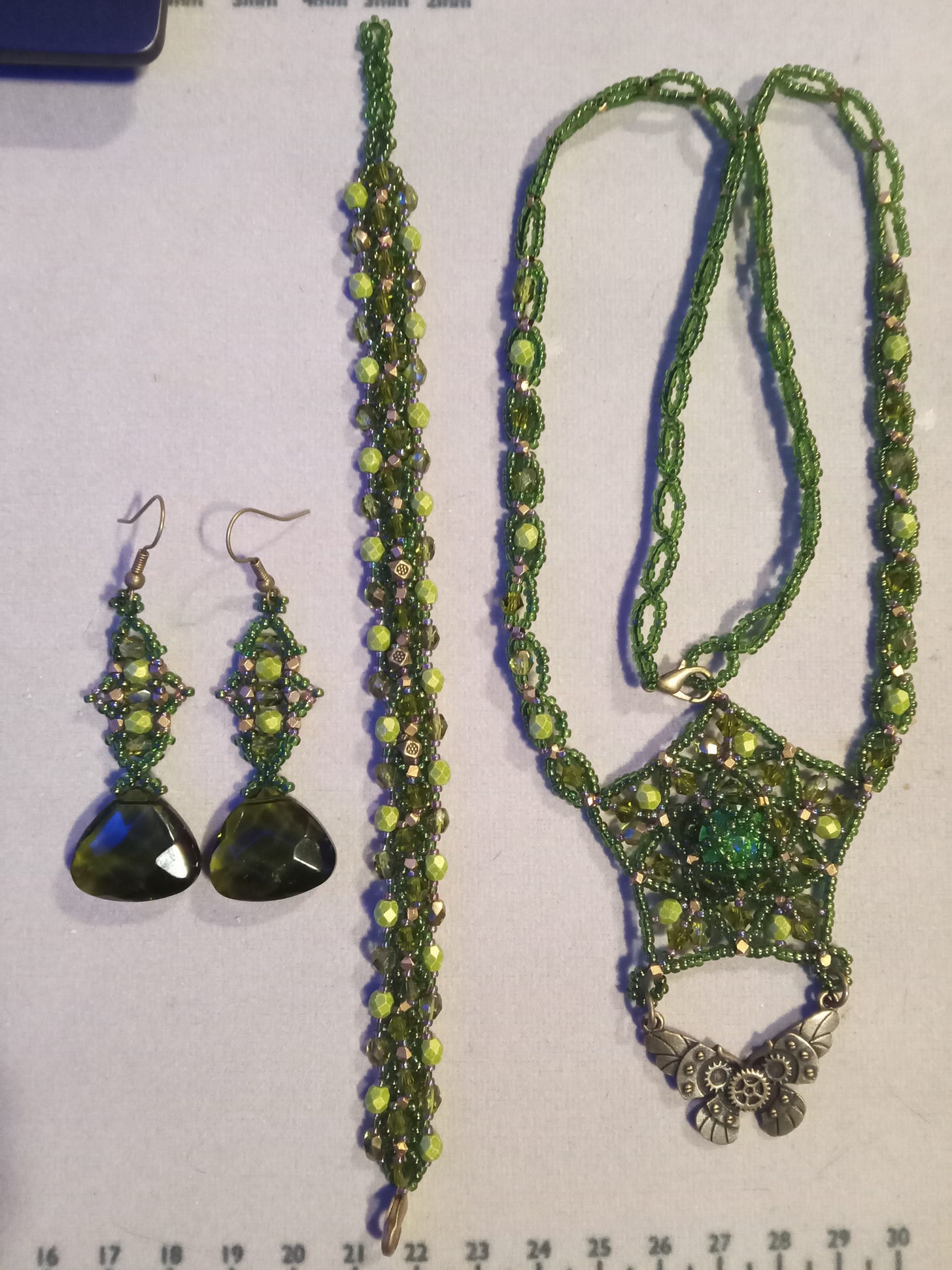 Sadly, part of this set was stolen while I had it on display at a local art show in April 2025. The thief made off with the necklace and one of the earrings, so I still have the bracelet and one earring. It is extremely upsetting that the earrings were split up because what is someone going to do with one earring? It probably ended up in the trash. I do not have another drop bead to remake the stolen earring and I don’t have another of the bronze butterflies but I may have enough of the other beads to remake it. I may try to find another butterfly but I am not sure what to do about the earrings. I had actually worn this set several times as I have a skirt that goes perfectly with it so I genuinely liked it apart from the sentimental value.